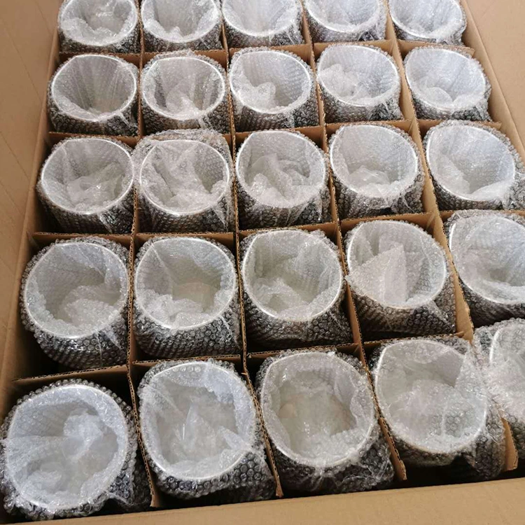 Upang matiyak ang ligtas na internasyonal na transportasyon, ang bawat aluminum cup ay nakabalot sa bubble wrap at nakaimpake sa isang puting karton, na epektibong pinipigilan ang pinsala mula sa banggaan at pagpilit sa panahon ng malayuang pagpapadala, na tinitiyak na maabot ng bawat produkto ang mga customer sa perpektong kondisyon.