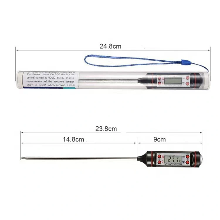 Sumusunod kami sa mga mahigpit na pamantayan sa kontrol ng parameter ng produkto, na tinitiyak na ang bawat thermometer ay may matatag na pagganap at tumpak na pagsukat. Ang solong kabuuang timbang ng thermometer ay 36 gramo, kabilang ang packaging tube, na magaan at portable, madaling iimbak at dalhin nang hindi kumukuha ng masyadong maraming espasyo. Sa mga tuntunin ng mga istrukturang sukat, ang haba ng probe ay 148mm—ang haba ng siyentipikong ito ay nagbibigay-daan sa probe na ganap na maabot ang sinusukat na bagay (gaya ng loob ng natutunaw na wax o pagkain) para sa tumpak na pagtukoy ng temperatura, habang iniiwasan ang mga gumagamit ng nakakapaso. Ang haba ng hawakan ay 90mm, na idinisenyo upang magkasya nang perpekto sa kamay para sa kumportableng pagkakahawak at madaling operasyon. Ang laki ng LCD display ay 28mm*11mm, na may malinaw na mga numero at mahusay na visibility, na nagpapahintulot sa mga user na basahin ang halaga ng temperatura nang mabilis at malinaw kahit na sa madilim na kapaligiran. Ang thermometer ay pinapagana ng isang LR44 mercury-free na baterya, na environment friendly, ligtas at madaling palitan, na tinitiyak ang pangmatagalan at matatag na paggamit ng produkto.